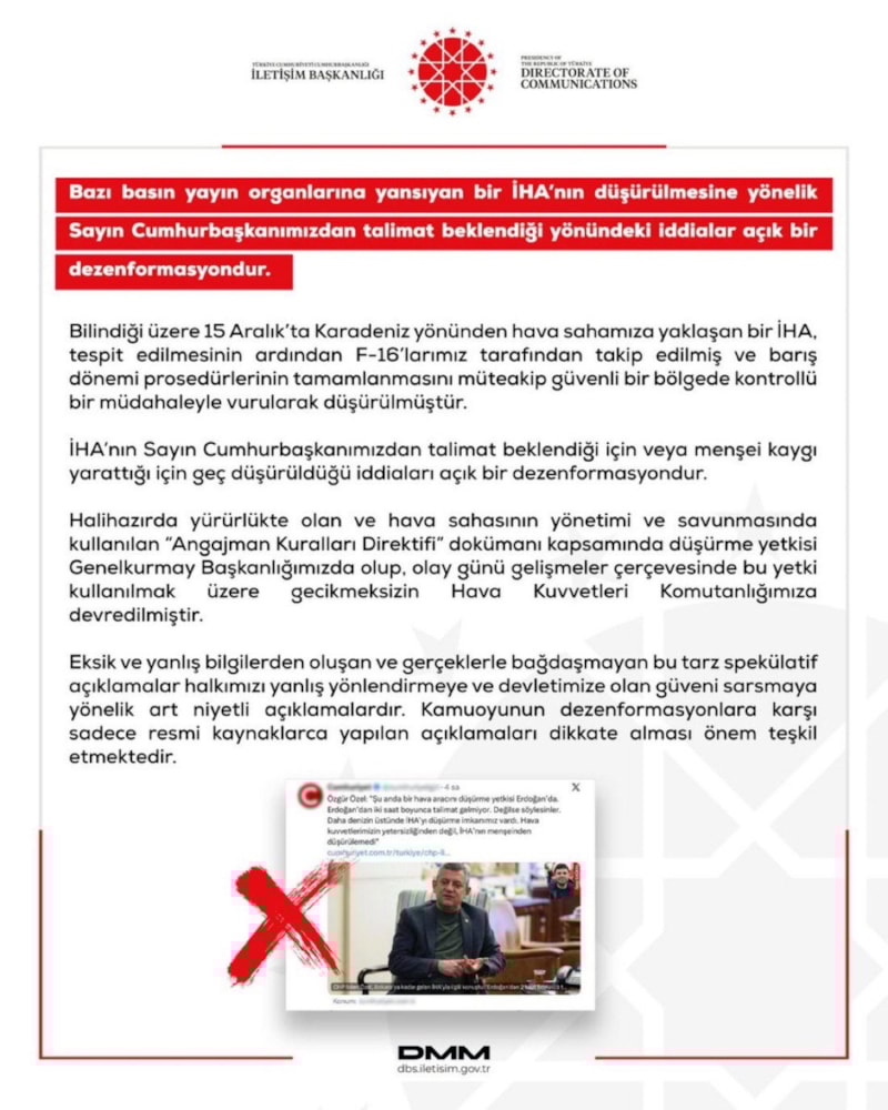 15 Aralık'ta Türk hava sahasına giren İHA'nın düşürülmesi için 2 saatten fazla süre Cumhurbaşkanı Erdoğan'ın onayının beklendiğini iddia eden Özgür Özel, İletişim Başkanlığı tarafından yapılan açıklama ile yalanlandı.