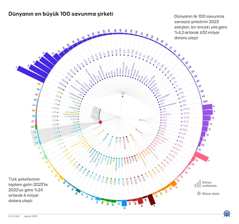 Bu kapsamda Stockholm Uluslararası Barış Araştırmaları Enstitüsünün (SIPRI), dünyanın ilk 100 savunma sanayisi şirketinin 2023 satışlarına ilişkin verileri yayınladı.