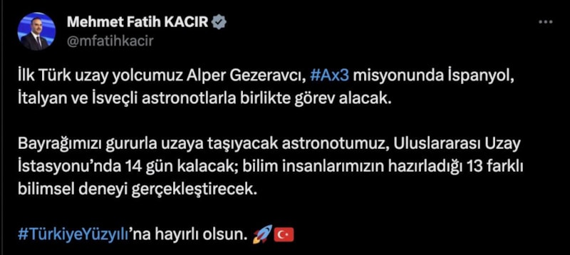 Kacır, "İlk Türk uzay yolcumuz Alper Gezeravcı, #Ax3 misyonunda İspanyol, İtalyan ve İsveçli astronotlarla birlikte görev alacak. Bayrağımızı gururla uzaya taşıyacak astronotumuz, Uluslararası Uzay İstasyonu’nda 14 gün kalacak; bilim insanlarımızın hazırladığı 13 farklı bilimsel deneyi gerçekleştirecek. #TürkiyeYüzyılı’na hayırlı olsun." ifadelerine yer verdi.