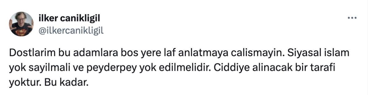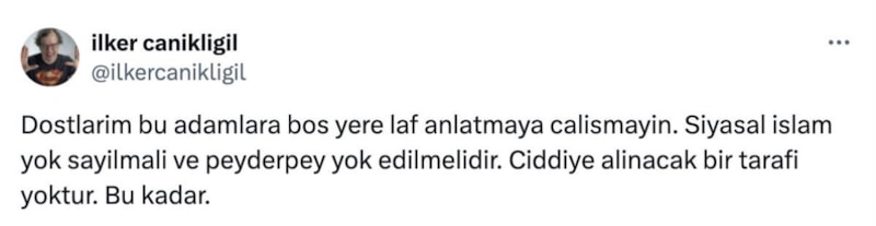 "Dostlarım bu adamlara boş yer laf anlatmaya çalışmayın Siyasal İslam yok sayılmalı ve peyderpey yok edilmeli. Ciddiye alınacak bir tarafı yoktur. Bu kadar.