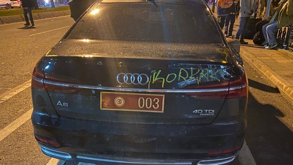 Araca saldıran grup, bagaj kapağına da 'Korkak' yazdı.