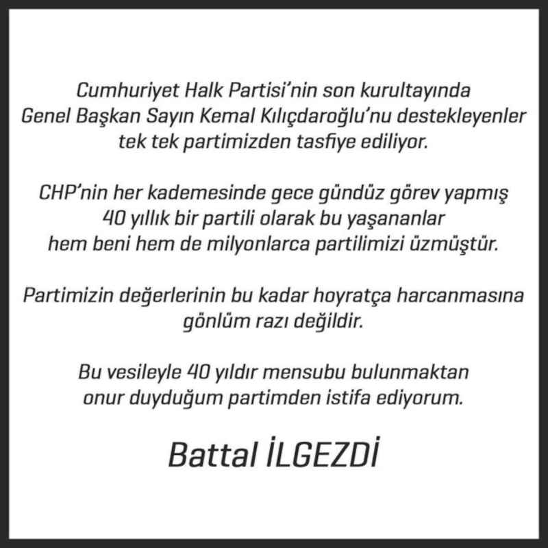 Sosyal medya hesabından CHP'den istifa ettiğini duyuran Ataşehir Belediye Başkanı Battal İlgezdi, mesajında şu ifadelere yer verdi: