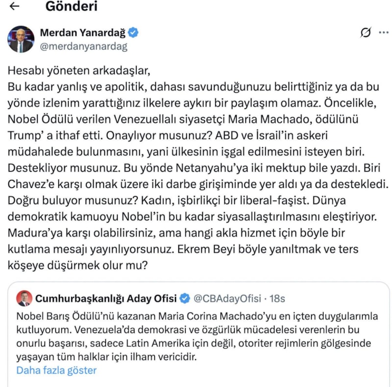 Merdan Yanardağ, Ekrem İmamoğlu'nun sosyal medya ekibine tepki gösterdi. İmamoğlu’nun, Nobel Barış Ödülü kazanan Maria Corina Machado’yu kutladığı paylaşımı alıntılayan Yanardağ "Bu kadar yanlış, apolitik ve savunduğunuz değerlere aykırı bir paylaşım olamaz" dedi.