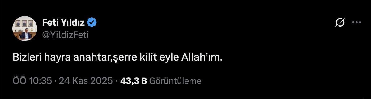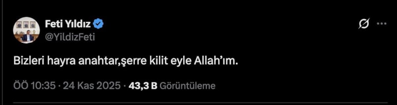 Yıldız, X hesabından "Bizleri hayra anahtar, şerre kilit eyle Allah’ım." ifadeleriyle dua etti.