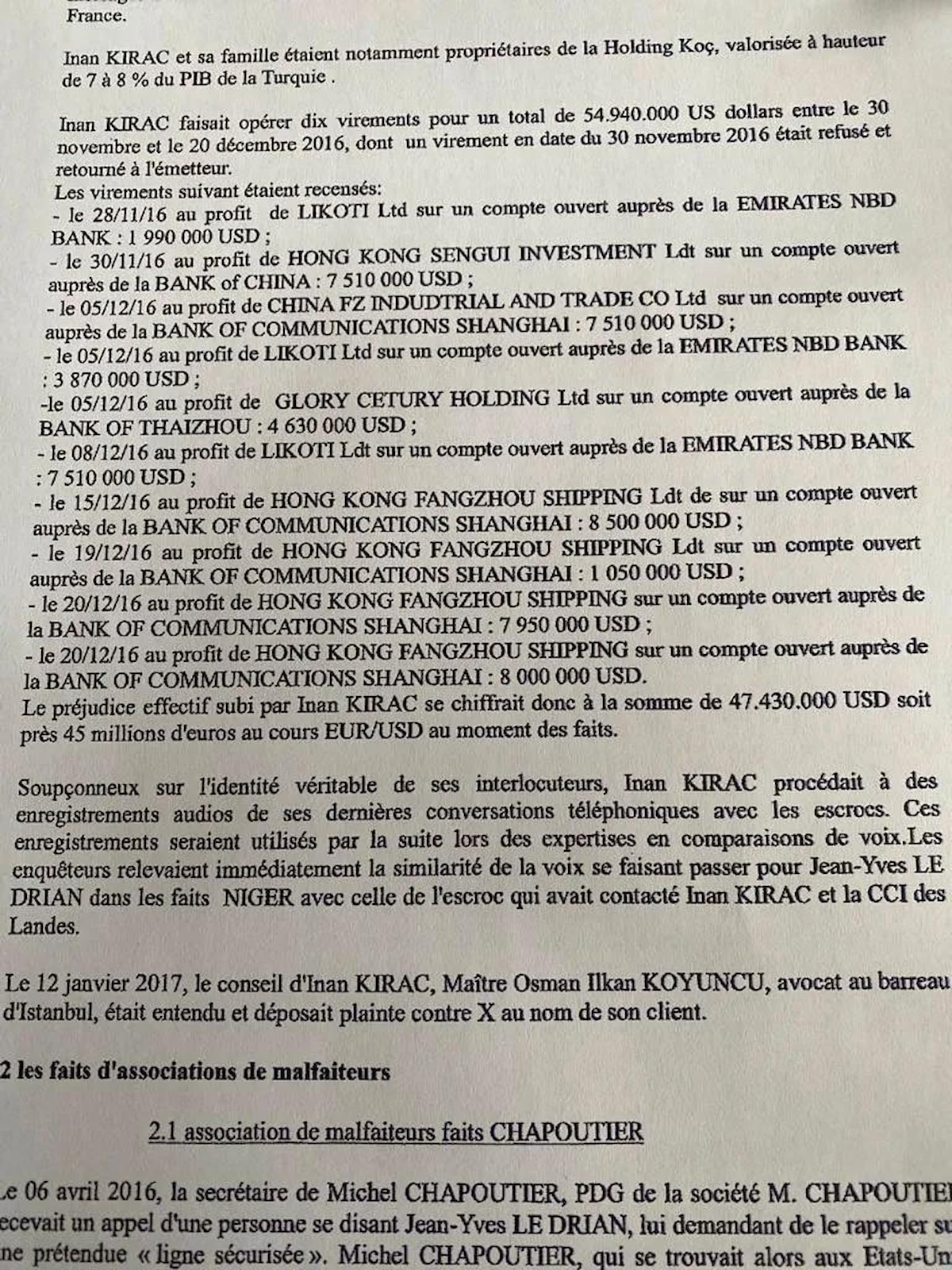 Muhataplarının gerçek kimliğinden şüphelenen İnan Kıraç, dolandırıcılarla yaptığı son telefon görüşmelerinin ses kaydını yaptı. Bu ses kayıtları üzerinden ses karşılaştırması yapıldı. Müfettişler, Nijer olaylarında Jean Yves Drian kılığına giren sesin, İnan Kıraç ve Landes CCI ile temasa geçen dolandırıcınınkiyle benzerliğini hemen fark ettiler. 12 Ocak 2017’de İnan Kıraç'ın avukatı Osman İlkan Koyuncu dinlendi ve müvekkili adına X hakkında suç duyurusunda bulundu. İnan Kıraç'ın uğradığı fiili zarar 47.430.000 ABD Doları veya olayların meydana geldiği tarihteki EUR/USD kuru üzerinden yaklaşık 45 milyon Euro tutarındadır.