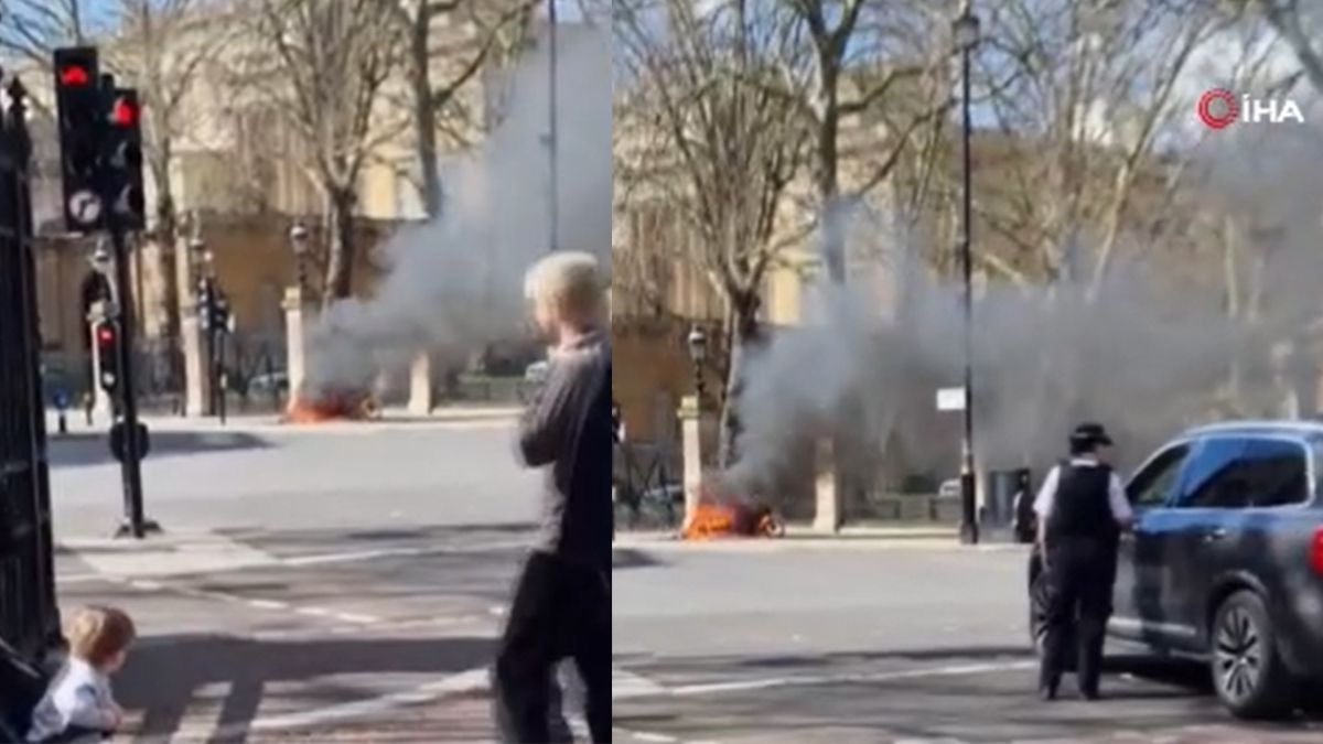 Buckingham Sarayı’nın önünde park halindeyken yaşanan olayda bisiklet alev alırken, patlamanın etkisiyle bisiklete ait parçalar çevreye saçıldı.