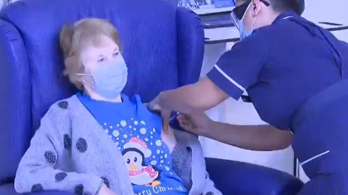 Ülkede ilk toplu aşılama başladı ve ilk fotoğraf geldi. 90 yaşındaki Margaret Keenan'a, Pfizer tarafından üretilen koronavirüs aşısının ilk dozu uygulandı.