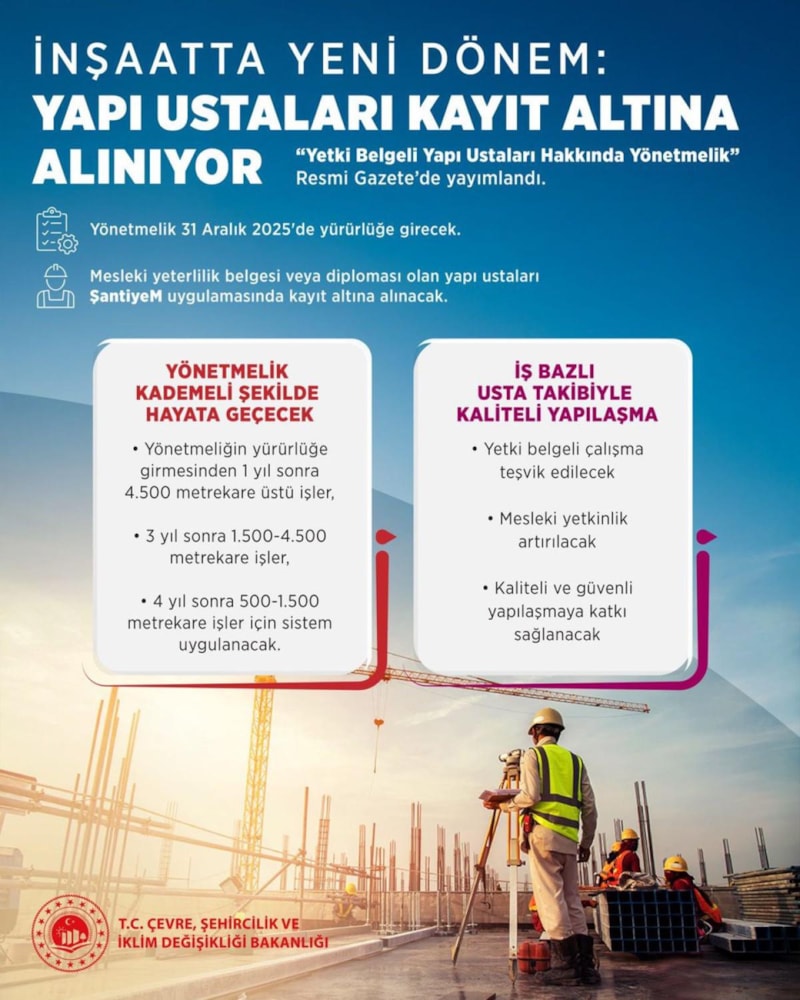 İnşaat sektöründe belgeli eleman sıkıntısı yaşanmaması için ustaların mesleki niteliklerinin artırılması ve öncü uygulamaların geliştirilmesi amacıyla yapı ustaları Bakanlığın sisteminde kayıt altında tutulacak.