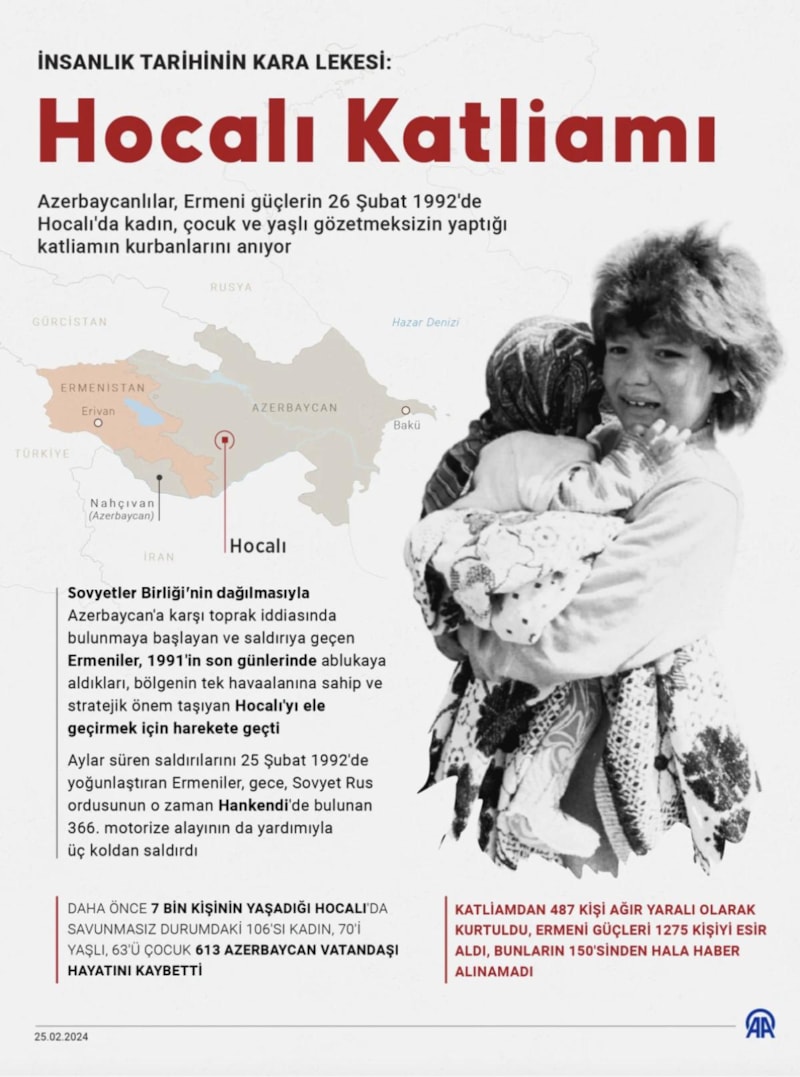 Ermeni güçlerinin 26 Şubat 1992'de Hocalı'da kadın, çocuk ve yaşlı gözetmeksizin yaptığı katliamın acısı 33 yıldır dinmiyor.
