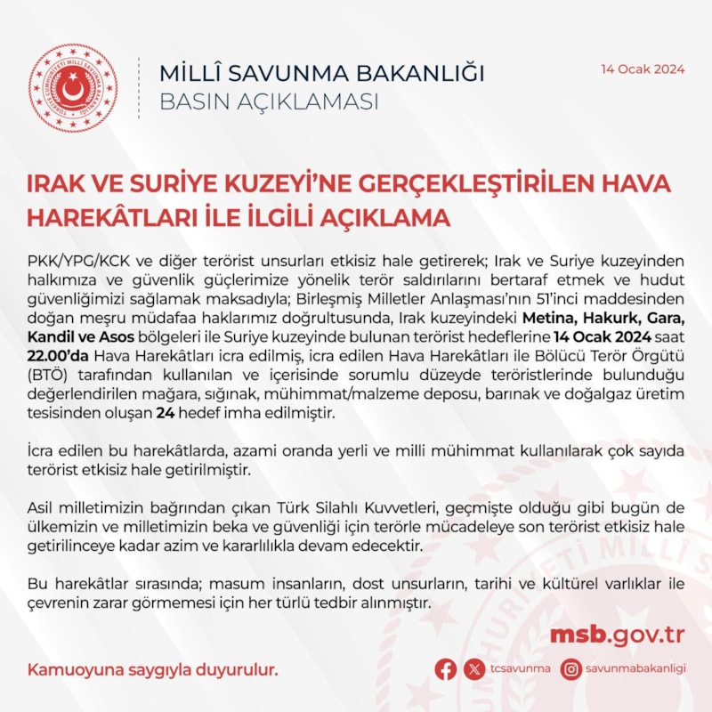Milli Savunma Bakanlığı (MSB), Irak ve Suriye'nin kuzeyine gerçekleştirilen hava harekatları ile ilgili açıklamada bulundu.