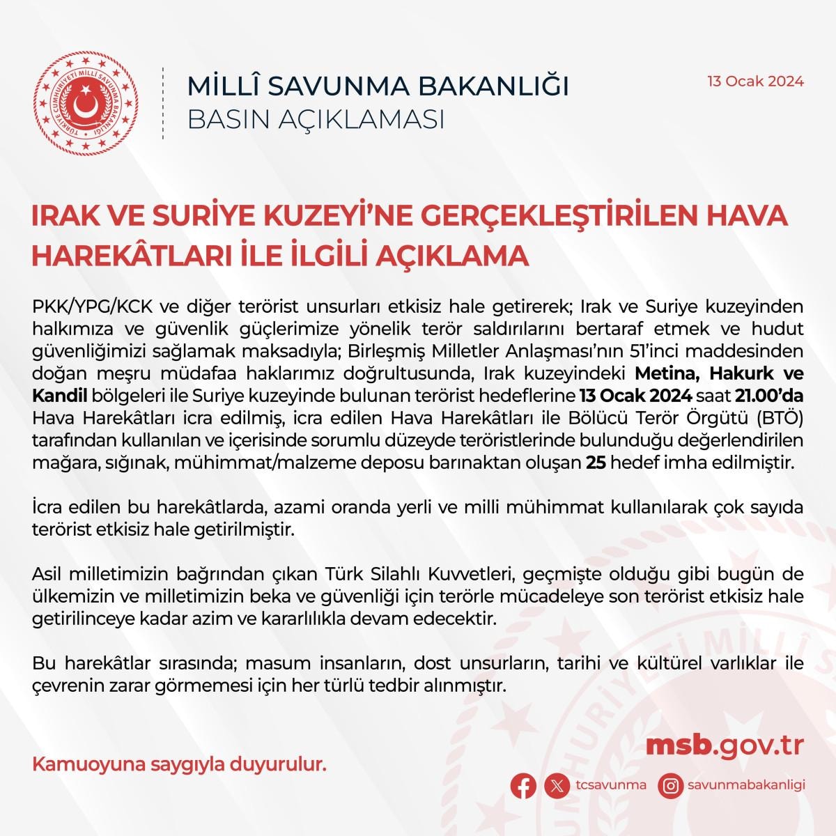 Açıklamada Suriye ve Irak'ın kuzeyine yapılan hava harekatında 25 terör hedefinin vurularak imha edildiği duyuruldu.