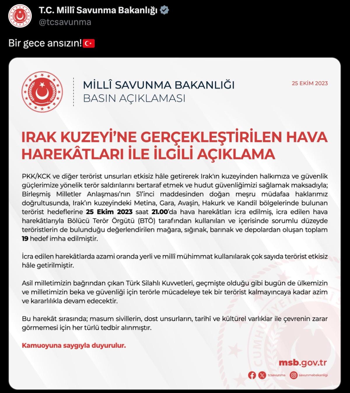 PKK/KCK ve diğer terörist unsurları etkisiz hale getirerek Irak'ın kuzeyinden halkımıza ve güvenlik güçlerimize yönelik terör saldırılarını bertaraf etmek ve hudut güvenliğimizi sağlamak maksadıyla; Birleşmiş Milletler Anlaşması'nın 51'inci maddesinden doğan meşru müdafaa haklarımız doğrultusunda, Irak'ın kuzeyindeki Metina, Gara, Avaşin, Hakurk ve Kandil bölgelerinde bulunan terörist hedeflerine 25 Ekim 2023 saat 21.00'da hava harekatları icra edilmiş, icra edilen hava harekâtlarıyla Bölücü Terör Örgütü (BTÖ) tarafından kullanılan ve içerisinde sorumlu düzeyde teröristlerin de bulunduğu değerlendirilen mağara, sığınak, barınak ve depolardan oluşan toplam 19 hedef imha edilmiştir.
