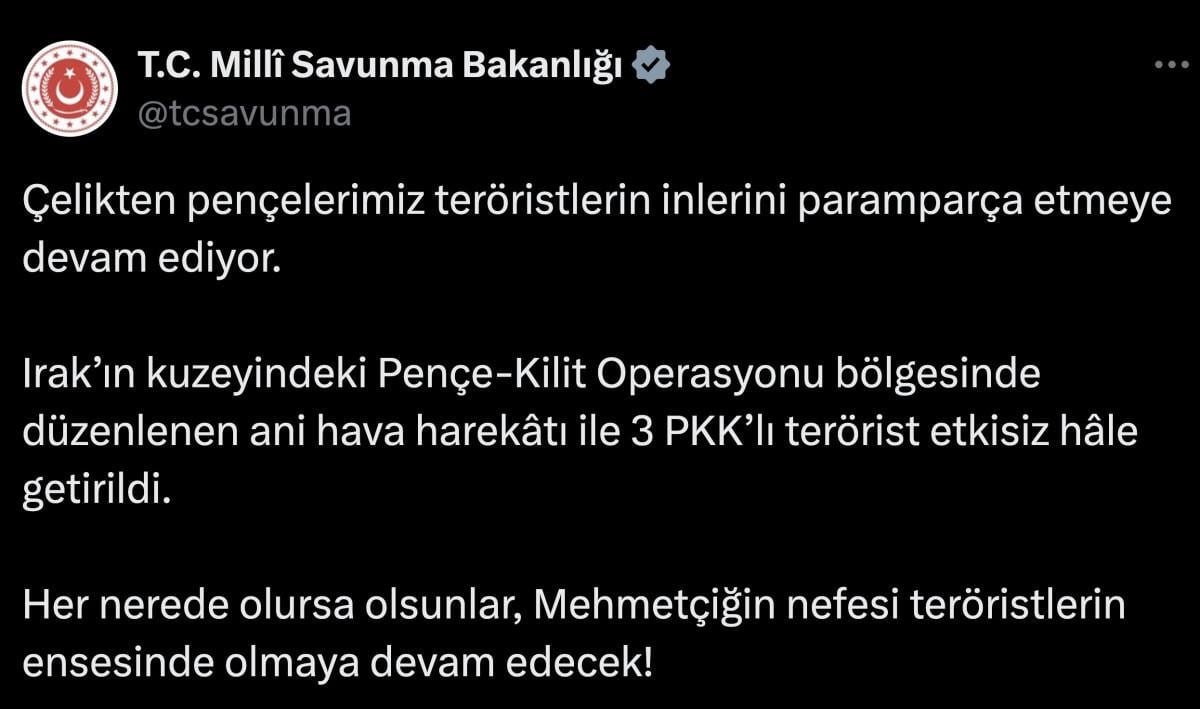 Milli Savunma Bakanlığı'ndan (MSB) yapılan açıklamada, 3 PKK'lının etkisiz hale getirildiği açıklandı.