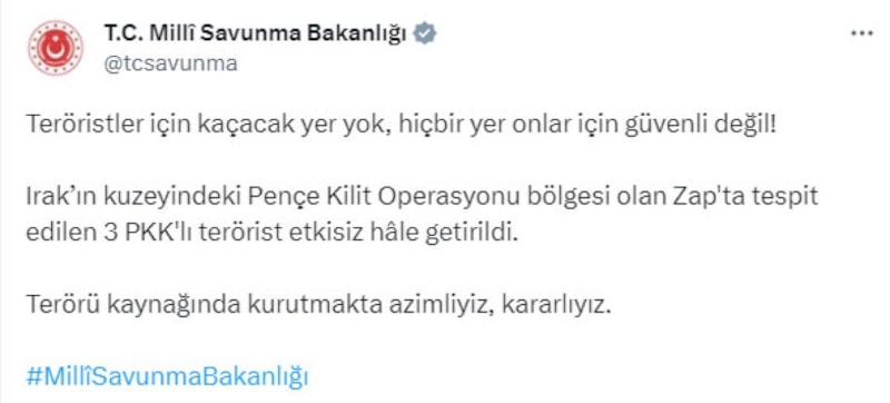 Milli Savunma Bakanlığı, Pençe Kilit Operasyonu bölgesi olan Zap'ta tespit edilen 3 PKK'lı teröristin Mehmetçik tarafından öldürüldüğünü açıkladı.