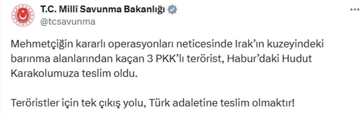 Milli Savunma Bakanlığı, Irak'ın kuzeyinde 3 teröristin kaçarak Habur'daki hudut karakoluna teslim olduğunu açıkladı.
