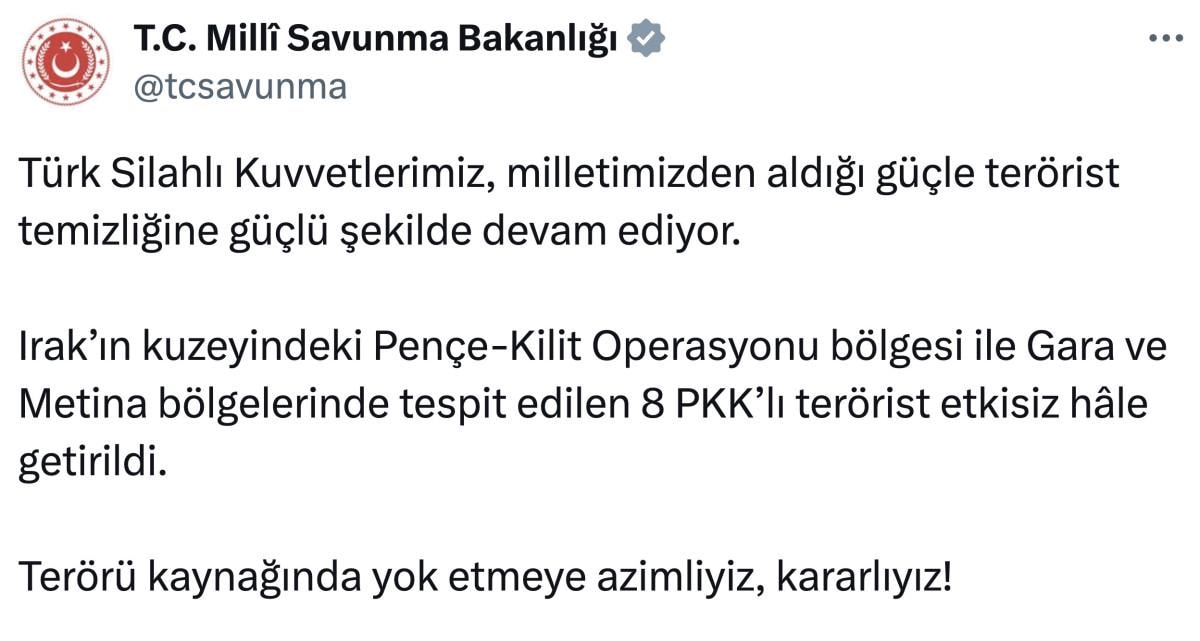 Irak’ın kuzeyindeki Pençe-Kilit Operasyonu bölgesi ile Gara ve Metina bölgelerinde tespit edilen 8 PKK’lı terörist etkisiz hâle getirildi.