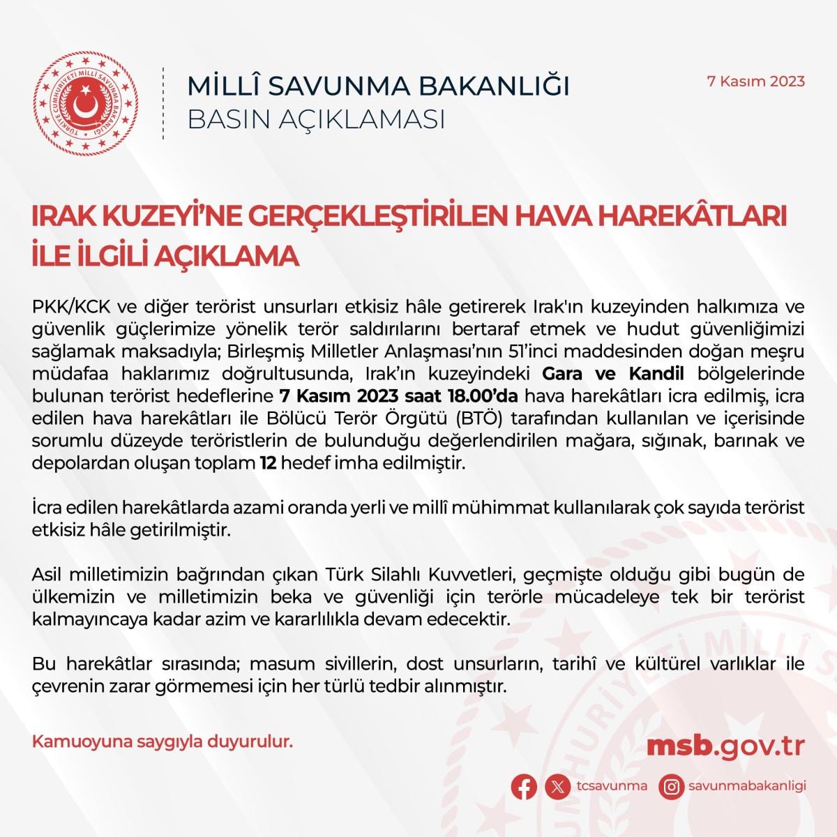 PKK/KCK ve diğer terörist unsurları etkisiz hale getirerek Irak'ın kuzeyinden halkımıza ve güvenlik güçlerimize yönelik terör saldırılarını bertaraf etmek ve hudut güvenliğimizi sağlamak maksadıyla; Birleşmiş Milletler Anlaşması’nın 51’inci maddesinden doğan meşru müdafaa haklarımız doğrultusunda, Irak’ın kuzeyindeki Gara ve Kandil bölgelerinde bulunan terörist hedeflerine 7 Kasım 2023 saat 18.00’da hava harekatları icra edilmiş, icra edilen hava harekatları ile Bölücü Terör Örgütü (BTÖ) tarafından kullanılan ve içerisinde sorumlu düzeyde teröristlerin de bulunduğu değerlendirilen mağara, sığınak, barınak ve depolardan oluşan toplam 12 hedef imha edilmiştir.