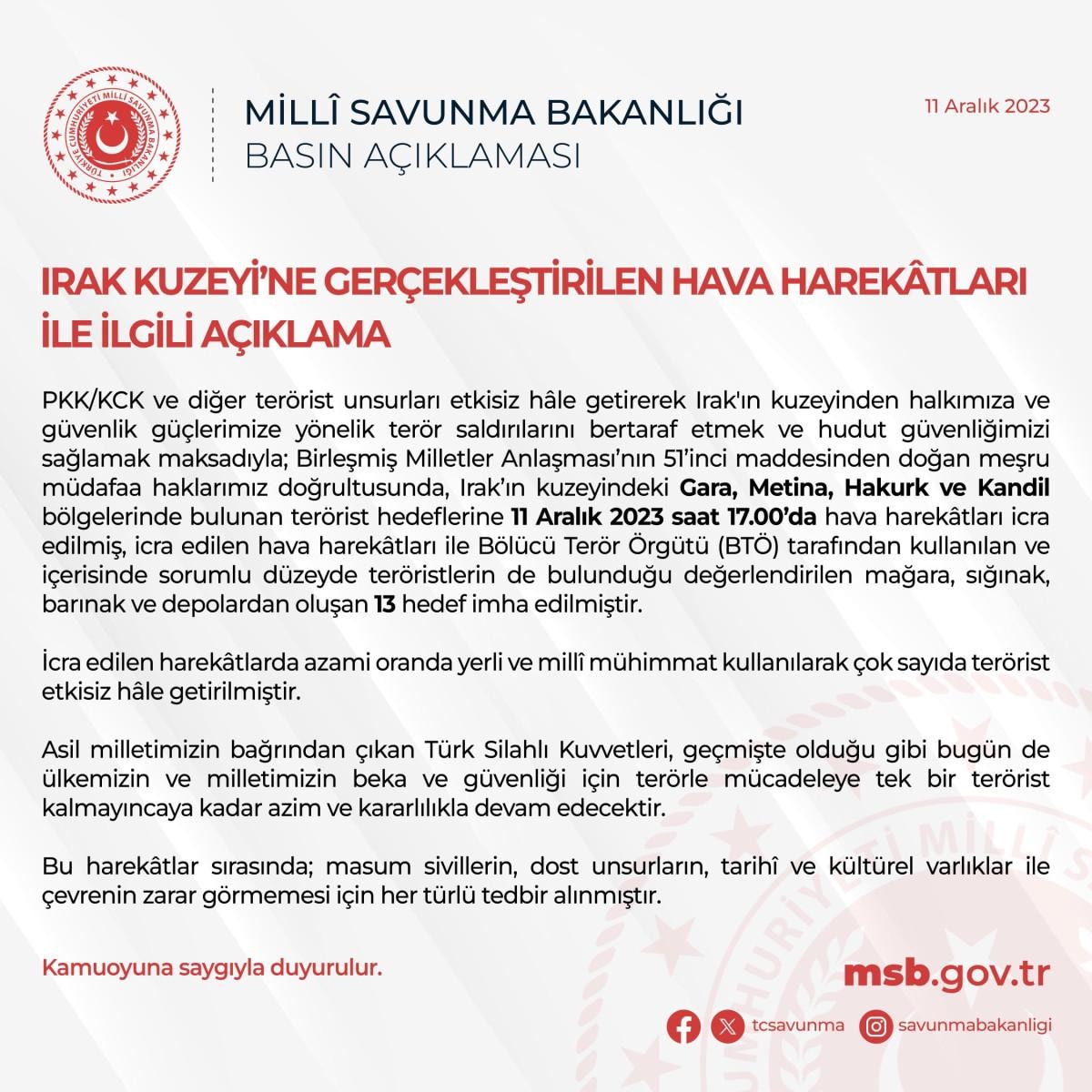 Milli Savunma Bakanlığı Irak'ın kuzeyine gerçekleştirilen hava harekatları ile ilgili açıklamalarda bulundu.