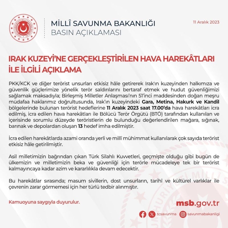 Milli Savunma Bakanlığı, Irak'ın kuzeyindeki Gara, Metina, Hakurk ve Kandil'e yönelik hava harekatında, içerisinde sorumlu düzeyde teröristlerin de bulunduğu 13 hedefin imha edildiğini açıkladı.