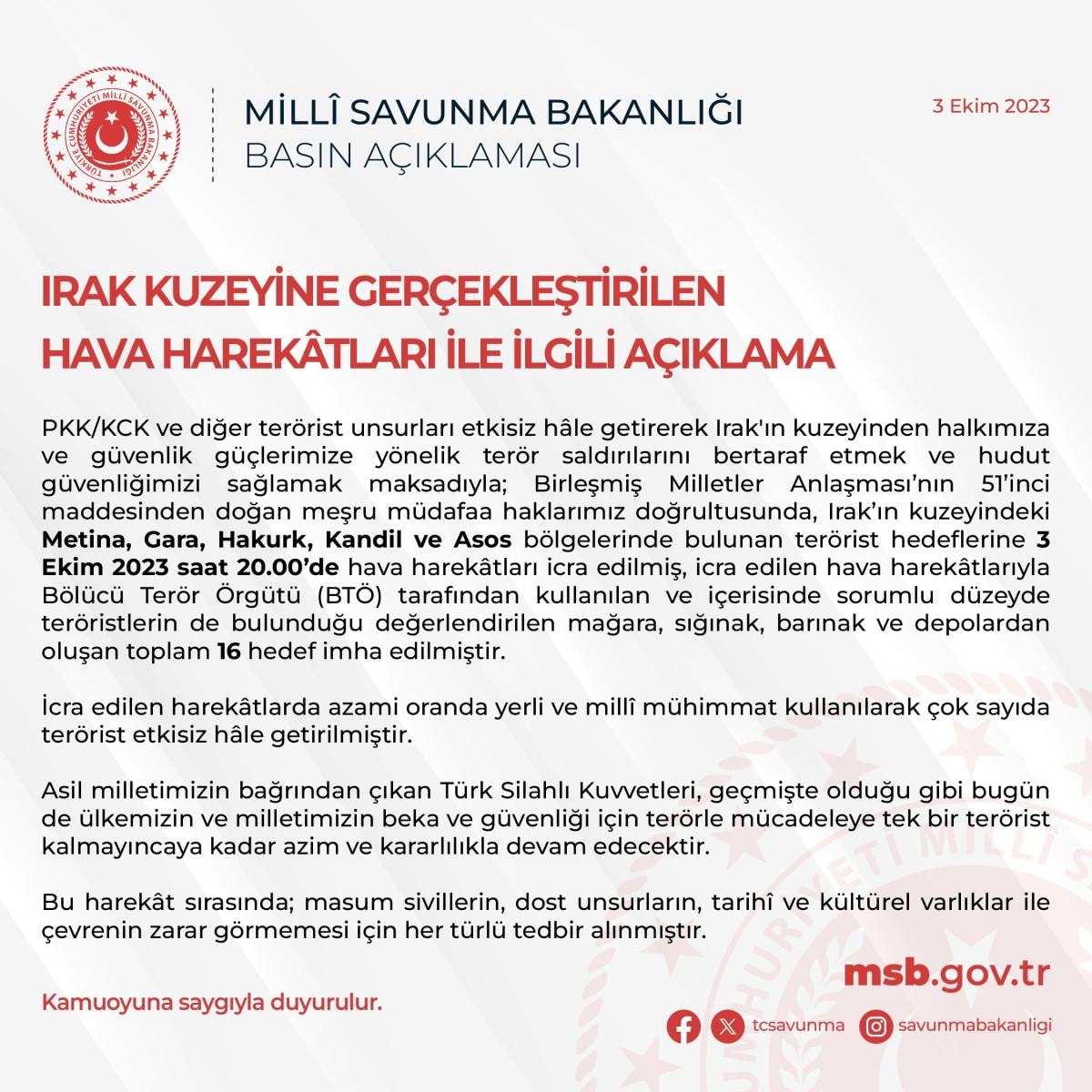 PKK/KCK ve diğer terörist unsurları etkisiz hâle getirerek Irak'ın kuzeyinden halkımıza ve güvenlik güçlerimize yönelik terör saldırılarını bertaraf etmek ve hudut güvenliğimizi sağlamak maksadıyla; Birleşmiş Milletler Anlaşması'nın 51'inci maddesinden doğan meşru müdafaa haklarımız doğrultusunda, Irak'ın kuzeyindeki Metina, Gara, Hakurk, Kandil ve Asos bölgelerinde bulunan terörist hedeflerine 3 Ekim 2023 saat 20.00'de hava harekâtları icra edilmiş, icra edilen hava harekâtlarıyla Bölücü Terör Örgütü (BTÖ) tarafından kullanılan ve içerisinde sorumlu düzeyde teröristlerin de bulunduğu değerlendirilen mağara, sığınak, barınak ve depolardan oluşan toplam 16 hedef imha edilmiştir.