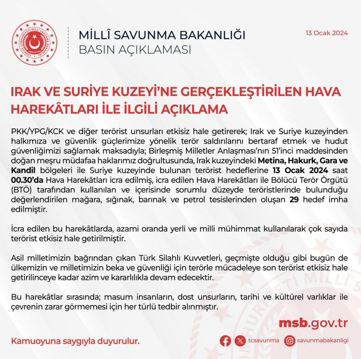 "PKK/YPG/KCK ve diğer terörist unsurları etkisiz hale getirerek; Irak ve Suriye kuzeyinden halkımıza ve güvenlik güçlerimize yönelik terör saldırılarını bertaraf etmek ve hudut güvenliğimizi sağlamak maksadıyla; Birleşmiş Milletler Anlaşması'nın 51'inci maddesinden doğan meşru müdafaa haklarımız doğrultusunda, Irak kuzeyindeki Metina, Hakurk, Gara ve Kandil bölgeleri ile Suriye kuzeyinde bulunan terörist hedeflerine 13 Ocak 2024 saat 00.30'da Hava Harekâtları icra edilmiş, icra edilen Hava Harekâtları ile Bölücü Terör Örgütü (BTÖ) tarafından kullanılan ve içerisinde sorumlu düzeyde teröristlerinde bulunduğu değerlendirilen mağara, sığınak, barınak ve petrol tesislerinden oluşan 29 hedef imha edilmiştir.