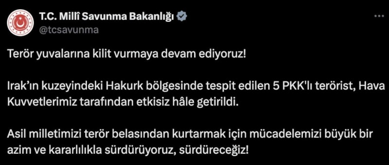 Milli Savunma Bakanlığı, Irak'ın kuzeyindeki Hakurk bölgesinde tespit edilen teröristlerin, hava harekatıyla öldürüldüğünü açıkladı.