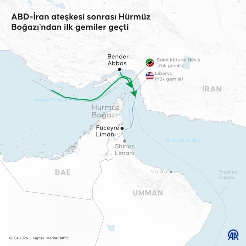 ABD ve İran arasında ABD Başkanı Donald Trump'ın Hürmüz Boğazı'nın tamamen açılması şartıyla sağlanan iki haftalık geçici ateşkes kararının ardından Boğaz'dan ilk gemiler geçiş yaptı.