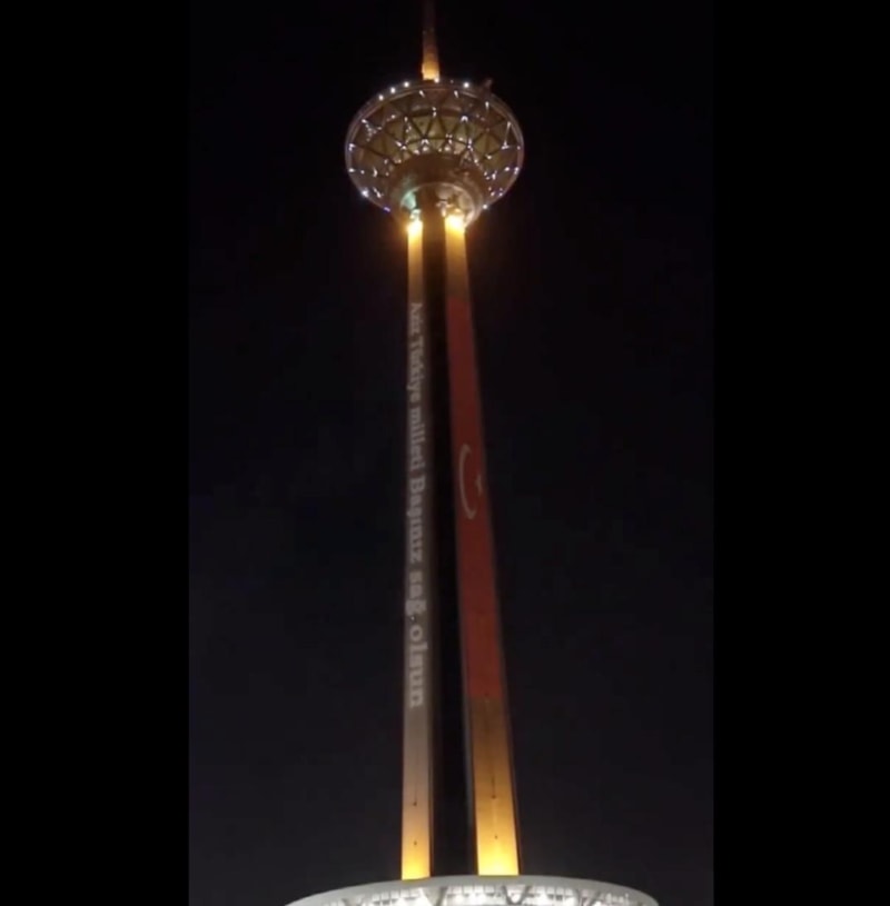 Kentin simgelerinden ve Tahran Belediyesi tarafından ışıklandırılan ülkenin en yüksek kulesine, Türkçe ve Farsça "Aziz Türkiye milleti başınız sağ olsun" mesajı yansıtıldı.