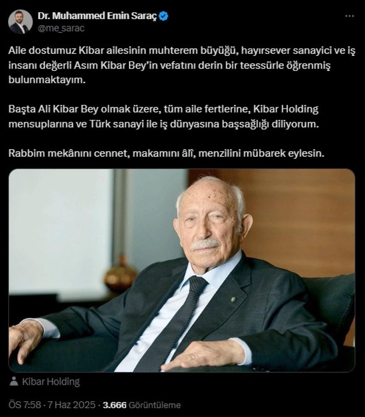 Saraç'ın paylaşımında, "Aile dostumuz Kibar ailesinin muhterem büyüğü, hayırsever sanayici ve iş insanı değerli Asım Kibar Bey’in vefatını derin bir teessürle öğrenmiş bulunmaktayım. Başta Ali Kibar Bey olmak üzere, tüm aile fertlerine, Kibar Holding mensuplarına ve Türk sanayi ile iş dünyasına başsağlığı diliyorum. Rabbim mekânını cennet, makamını âlî, menzilini mübarek eylesin" ifadeleri yer aldı.