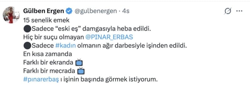 Gülben Ergen de, "15 senelik emek Sadece “eski eş” damgasıyla heba edildi. Hiç bir suçu olmayan Pınar Erbaş. Sadece kadın olmanın ağır darbesiyle işinden edildi. En kısa zamanda farklı bir ekranda, farklı bir mecrada Pınar Erbaş'ı işinin başında görmek istiyorum." dedi.