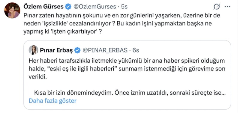 Pınar Erbaş'ın işine son verildiğini açıklamasının ardından Nevşin Mengü, Gülben Ergen ve Özlem Gürses olmak üzere birçok isimden destek mesajları geldi.