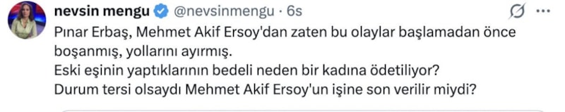 Destek veren isimlerden Nevşin Mengü, "Pınar Erbaş, Mehmet Akif Ersoy'dan zaten bu olaylar başlamadan önce boşanmış, yollarını ayırmış. Eski eşinin yaptıklarının bedeli neden bir kadına ödetiliyor? Durum tersi olsaydı Mehmet Akif Ersoy'un işine son verilir miydi?" diye yazarken, Özlem Gürses ise şöyle dedi;