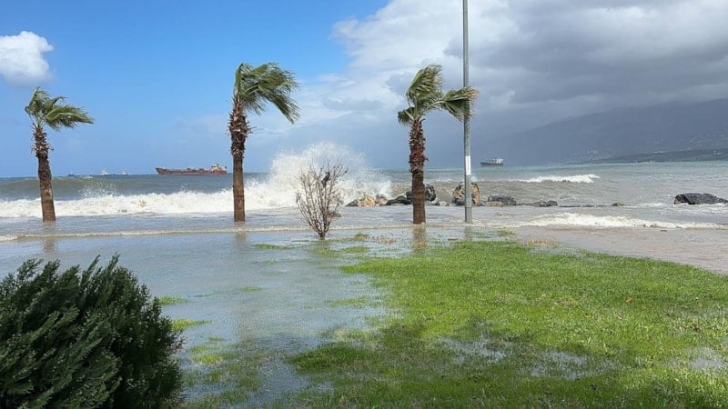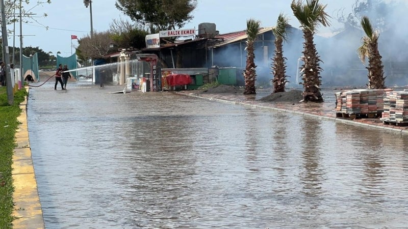 Meteoroloji'nin uyardığı kuvvetli rüzgar ve fırtına denizde devasa dalgalar oluşturdu. Sahil şeridini su basması ve dalgalarla birlikte su altında kalan bir kafede, elektrik kontağından yangın çıktı.