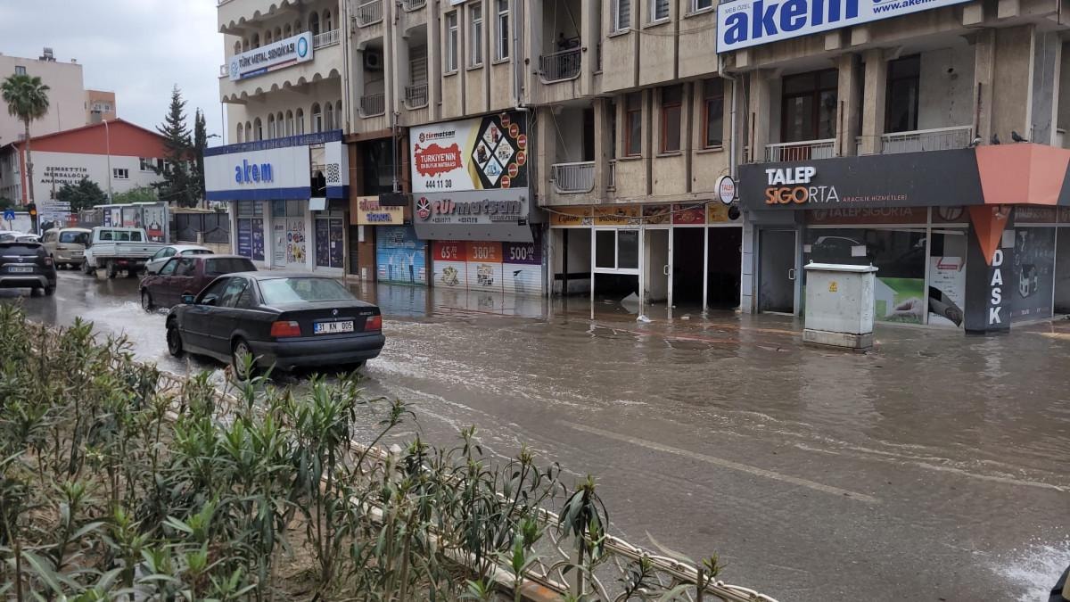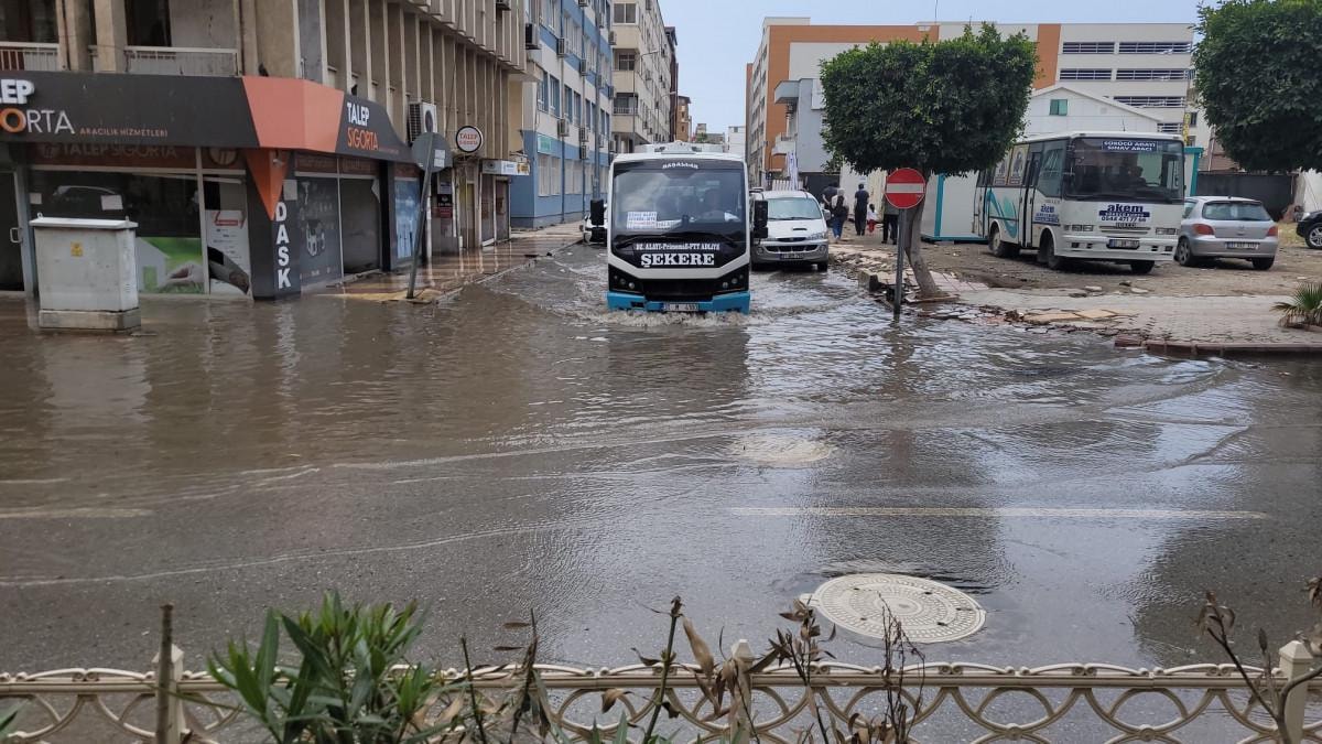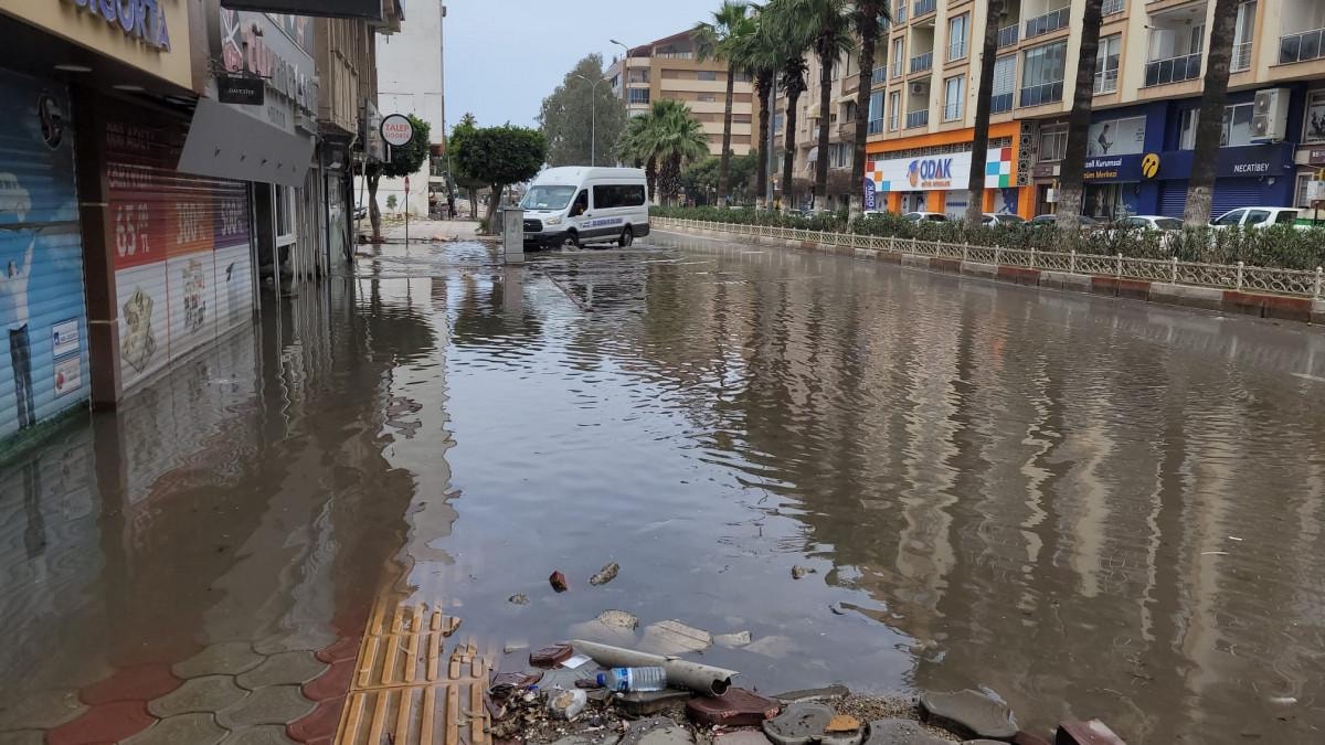 Yağmurun etkili olduğu Amanos Dağları'ndan gelen sel suları, yükselme nedeniyle denize akmayınca Atatürk Caddesi'nde rögarlar taştı.