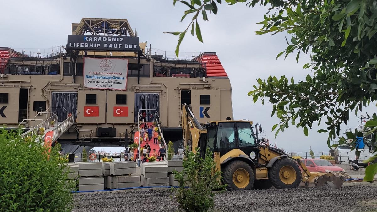Balıkçı Barınağı’na demirleyen ve öğrencileri sınavlarına hazırlanan Karadeniz Lifeship Rauf Bey Yaşam Gemisi'nin önüne de kepçelerde dolgu malzemesi dökülüyor.