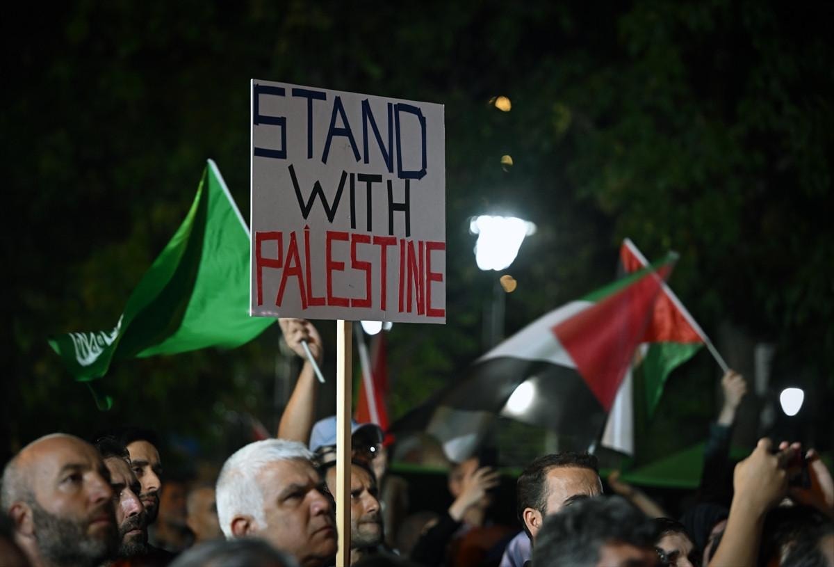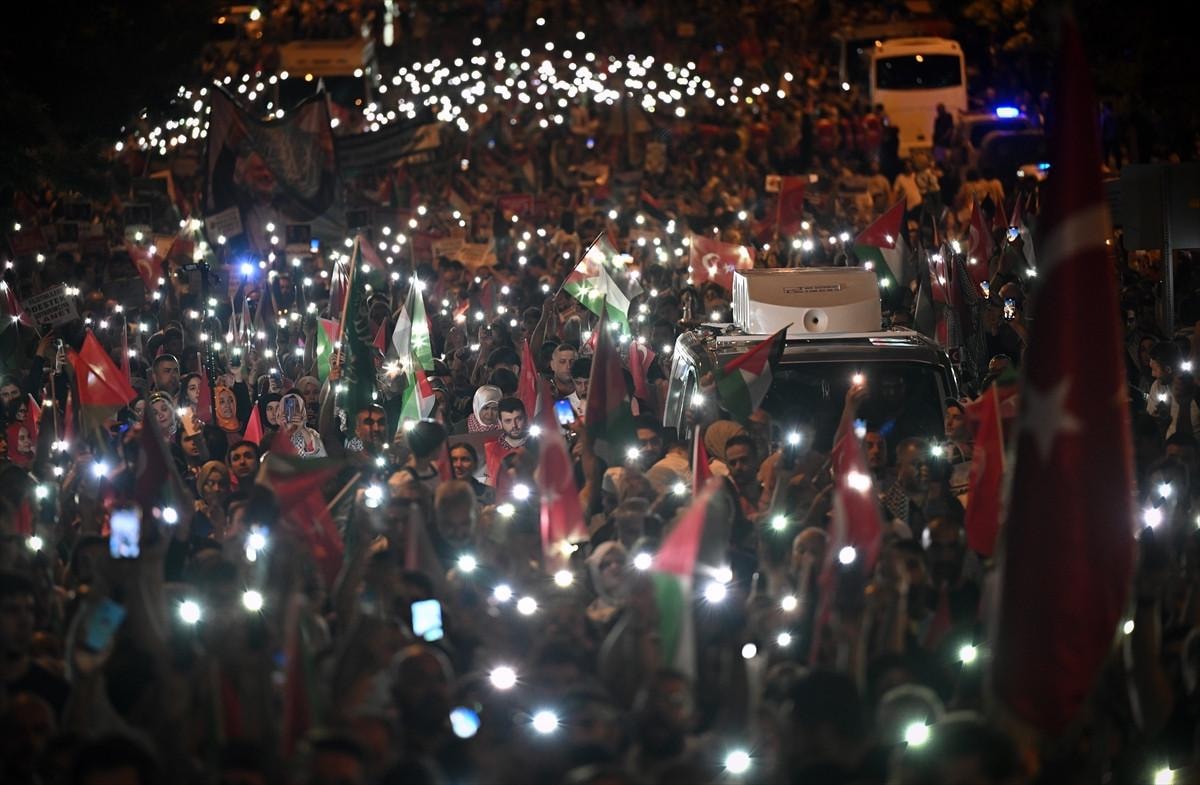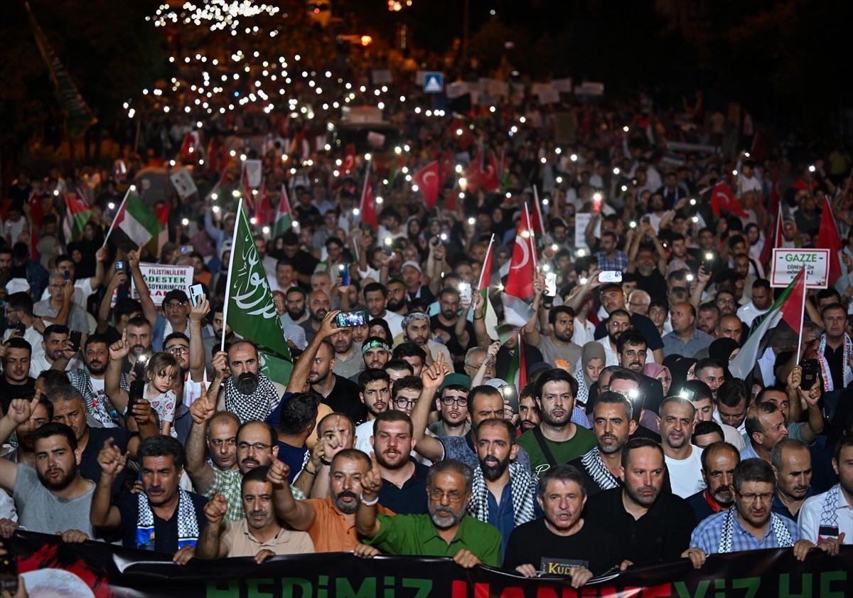 Hamas Siyasi Büro Başkanı İsmail Heniyye'nin İran'ın başkenti Tahran'da suikasta uğramadan önce Filistinlilere destek için yaptığı çağrı doğrultusunda başkentte binlerce kişi, ABD'nin Ankara Büyükelçiliği önünde toplandı.