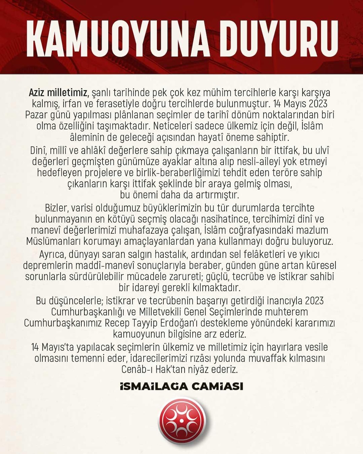 Camianın 'İsmailağa Camii' isimli Twitter hesabından yapılan paylaşımda, "Tercihimizi dinîive manevi değerlerimizi muhafazaya çalışan, İslâm coğrafyasındaki mazlum Müslümanları korumayı amaçlayanlardan yana kullanmayı doğru buluyoruz." ifadeleri kullanıldı.