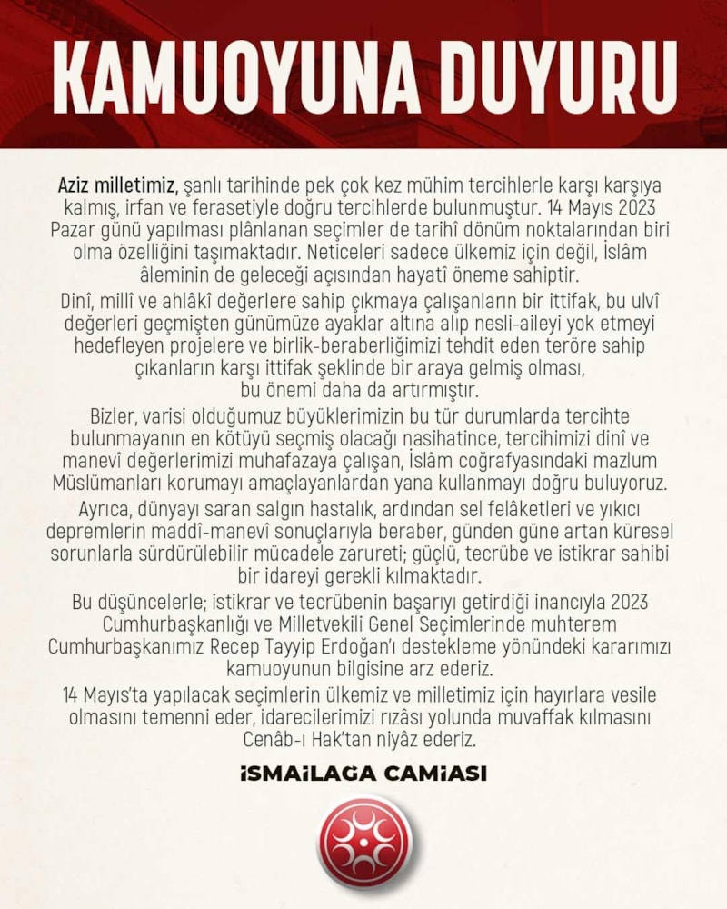 İsmailağa Camiası, 14 Mayıs'ta yapılacak Cumhurbaşkanlığı ve Milletvekili Genel Seçimlerinde Cumhurbaşkanı Recep Tayyip Erdoğan'ı destekleyeceklerini duyurdu.