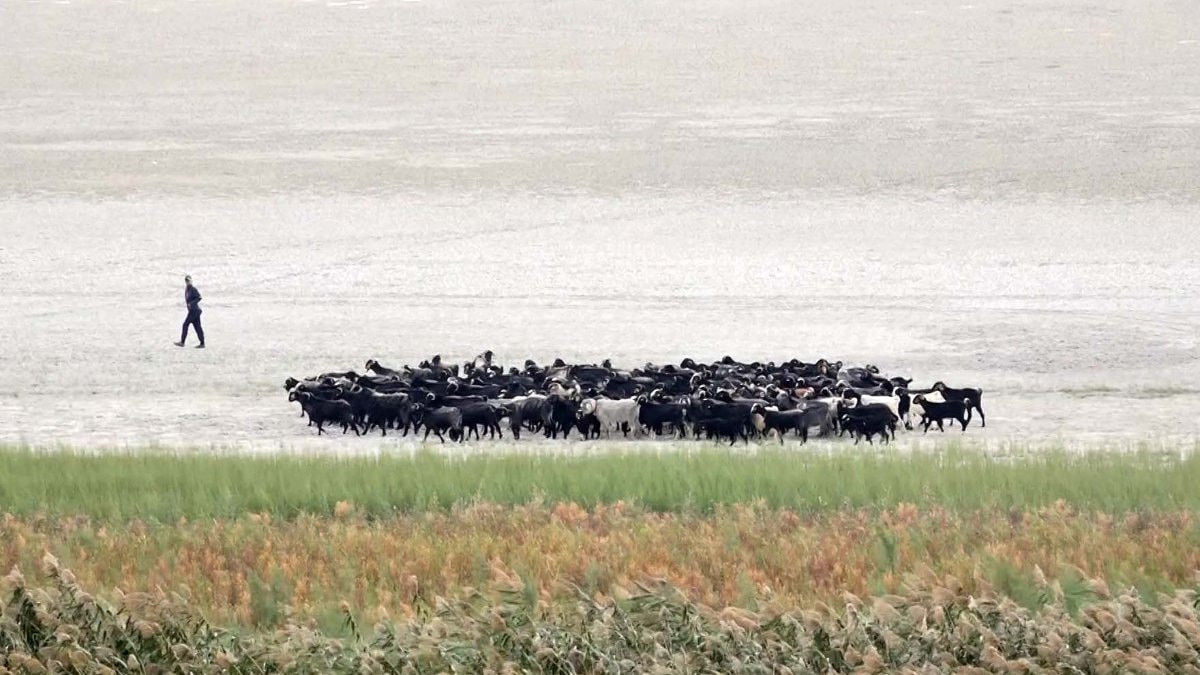 Gölün bölünmesinin ardından ortaya çıkan yeni kara parçasında, çobanların hayvanlarını otlattıkları gözlendi.