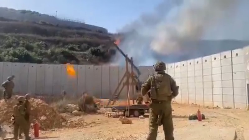 Gazze'de soykırım yapan katil İsrail askerleri, kuzeyde Hizbullah ile çatıştığı Lübnan sınırında kurduğu mancınık sistemiyle tarlalara alev topu fırlattı.