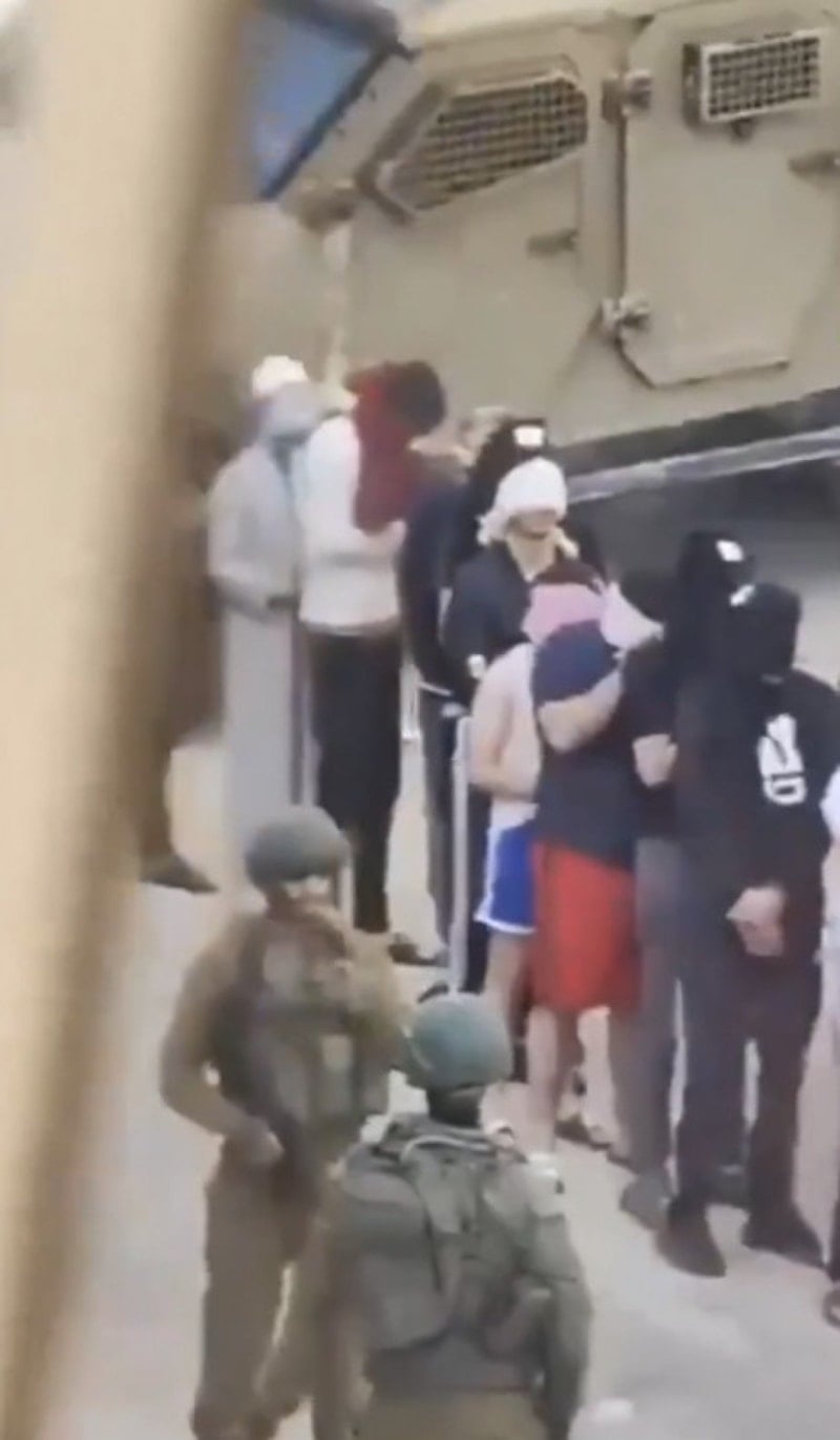 Yaş grupları değişkenlik gösteren gençleri gözaltına alan İsrail ordusu, tek tek sıraya dizdiği gençlerin gözlerini de bağladı.