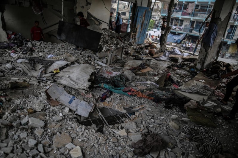 Gazze'deki hükümetin medya ofisinin Telegram hesabından yapılan yazılı açıklamada, İsrail ordusunun, Nusayrat Mülteci Kampı 2. bölgesinde onlarca yerinden edilmiş insanın barındığı bir okulu bombalayarak korkunç bir katliam gerçekleştirdiği belirtildi.