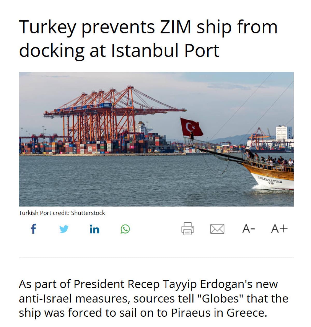 Globes, bunun Türkiye'nin 15 ay önce uyguladığı ticaret ambargosunun genişletilmesi anlamına geldiğini, ancak nakliye şirketlerinin hala Türk hükümetinden net talimatlar beklediğini bildirdi.