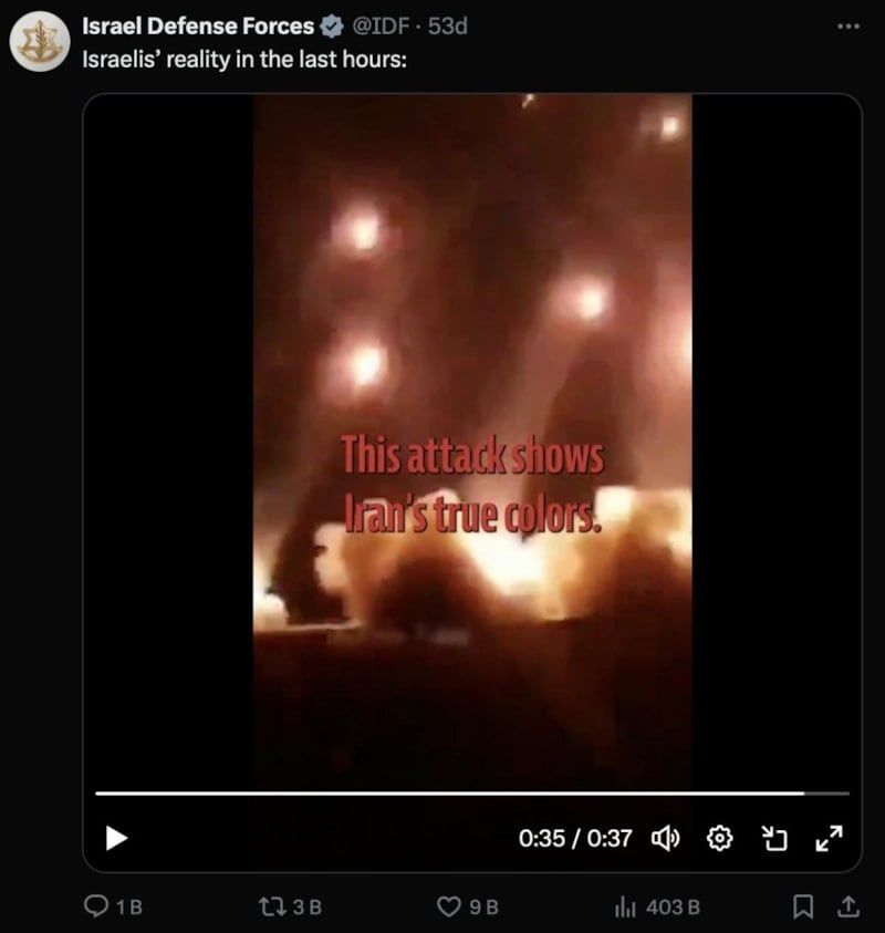 İran'ın İsrail'e yönelik başlattığı hava saldırısına ilişkin görüntüler İsrail Savunma Kuvvetleri'nin resmi hesabından paylaşıldı. Ancak görüntülerin bir kısmının 7 yıl öncesinden ve Rusya'ya ait olduğu belirlendi.