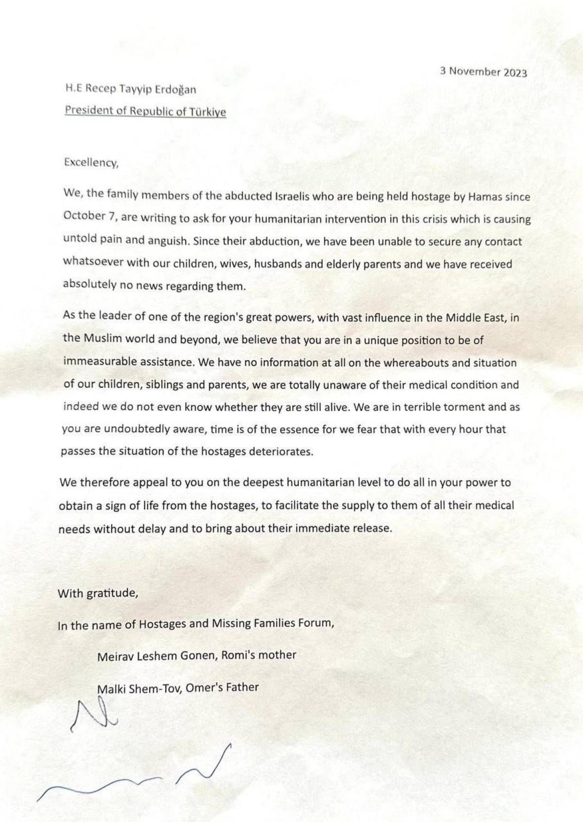 Yardım talep edilen mektubu İsrail'deki 'Rehineler ve Kayıp Aileler Forumu' kaleme aldı ve "Bizler, tarifsiz acı ve ıstıraba neden olan bu krize müdahale etmenizi istemek için sizin yardımınızı talep ediyoruz. Kaçırılmalarından bu yana çocuklarımız, eşlerimiz, kocalarımız, ebeveynlerimizle iletişim kuramadık." ifadelerine yer verildi.