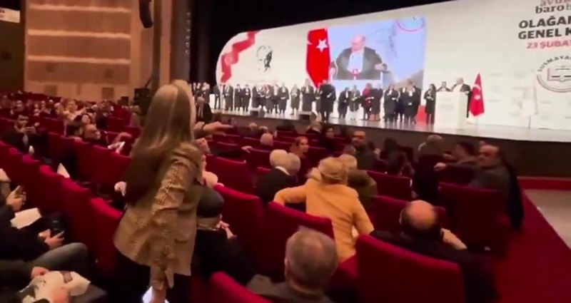İstanbul 1 No'lu Barosu'nun Olağanüstü Genel Kurul toplantısında yabancı hukuk temsilcilerinin Türkiye'yi hedef alan konuşmaları sırasında yerinden kalkan kadın avukat, "Emperyalizmin temsilcileri mi bize insan haklarını öğretecek? Filistin için tek laf etmeyen biri hangi hukuktan bahsediyor?" diyerek tepki gösterdi.
