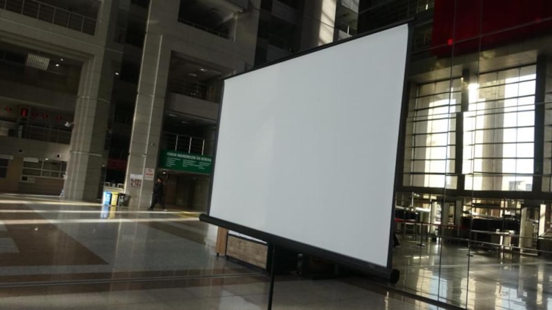 Adliyenin atrium alanına Yüksek Seçim Kurulu resmi sonuçları yansıtılmak üzere büyük ekran kuruldu. Yayın yasağının kaldırılması ile birlikte veriler büyük ekrandan takip edilebilecek.