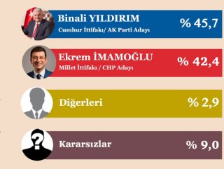 Araştırmada, vatandaşa ‘Bugün İstanbul Büyükşehir Belediye Başkanlığı seçimi olsa hangi adaya oy verecekleri’ soruldu. Yüzde 45,7’lik kesim AK Parti'nin adayı Binali Yıldırım, yüzde 42,4’lük kesim CHP’nin adayı Ekrem İmamoğlu dedi.