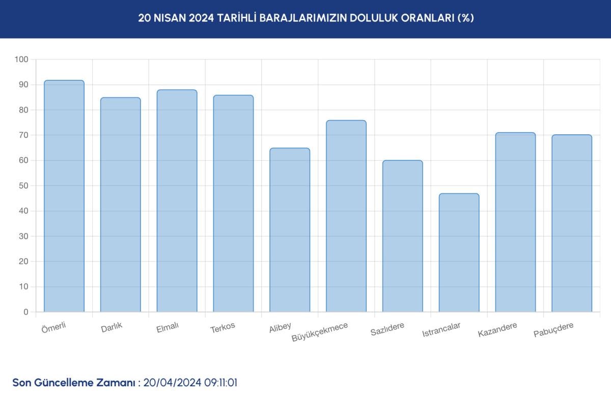 İSKİ istatistiklerine göre, 20 Nisan tarihli baraj doluluk oranları 2016'da yüzde 87,16, 2017'de yüzde 89,63, 2018'de yüzde 89,61, 2019'da yüzde 94,11, 2020'de yüzde 63,99, 2021'de yüzde 66,84, 2022'de yüzde 88,63, 2023'te yüzde 37,02 iken, bugünkü oran yüzde 80,71 olarak kayıtlara geçti.