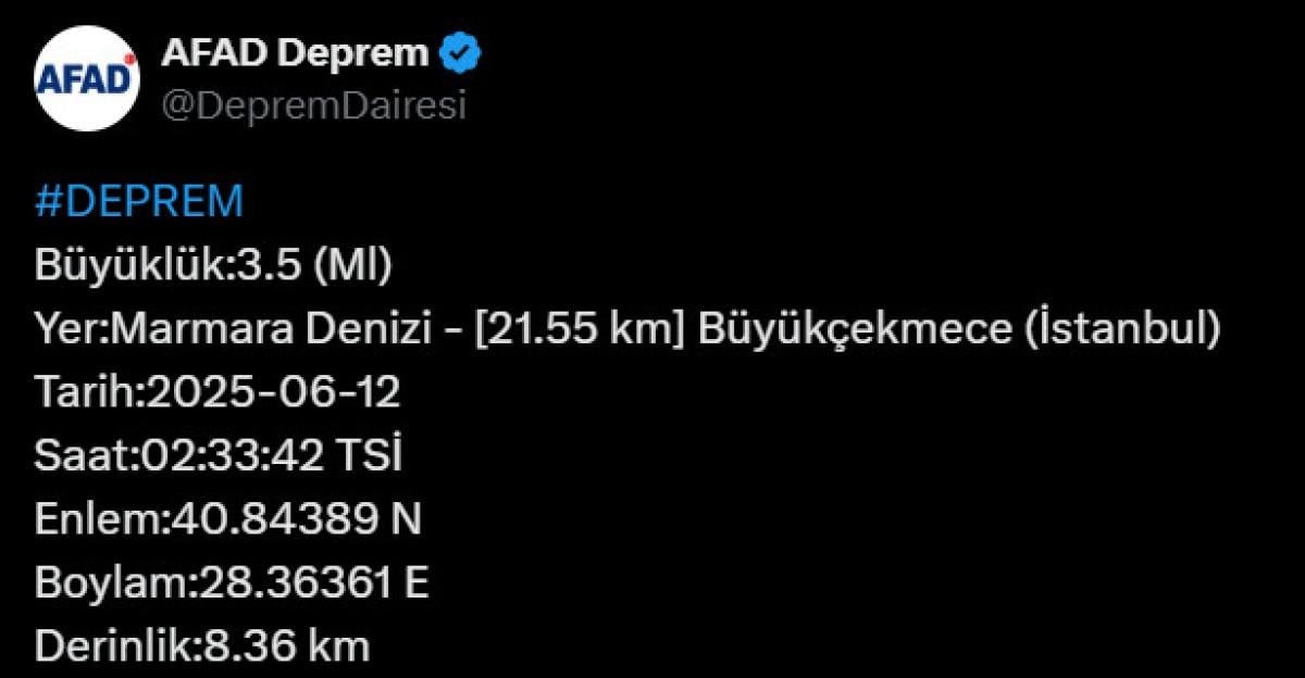 Afet ve Acil Durum Yönetimi Başkanlığı'nın internet sitesinde yer alan bilgiye göre saat 02.33'te, merkez üssü Marmara Denizi olan 3.5 büyüklüğünde sarsıntı kaydedildi.
